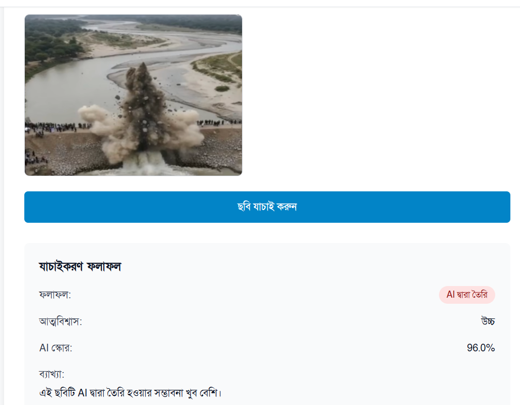 এছাড়া, বাংলা কৃত্রিম বুদ্ধিমত্তা সম্পন্ন ফ্যাক্টচেকিং প্রতিষ্ঠান 'খোঁজ'-এর নিজস্ব এআই ছবি শনাক্তকরণ সিস্টেমে ছবিটি বিশ্লেষণ করে দেখা গেছে — এটি ৯৬% নিশ্চয়তায় কৃত্রিমভাবে তৈরি (AI-generated)।